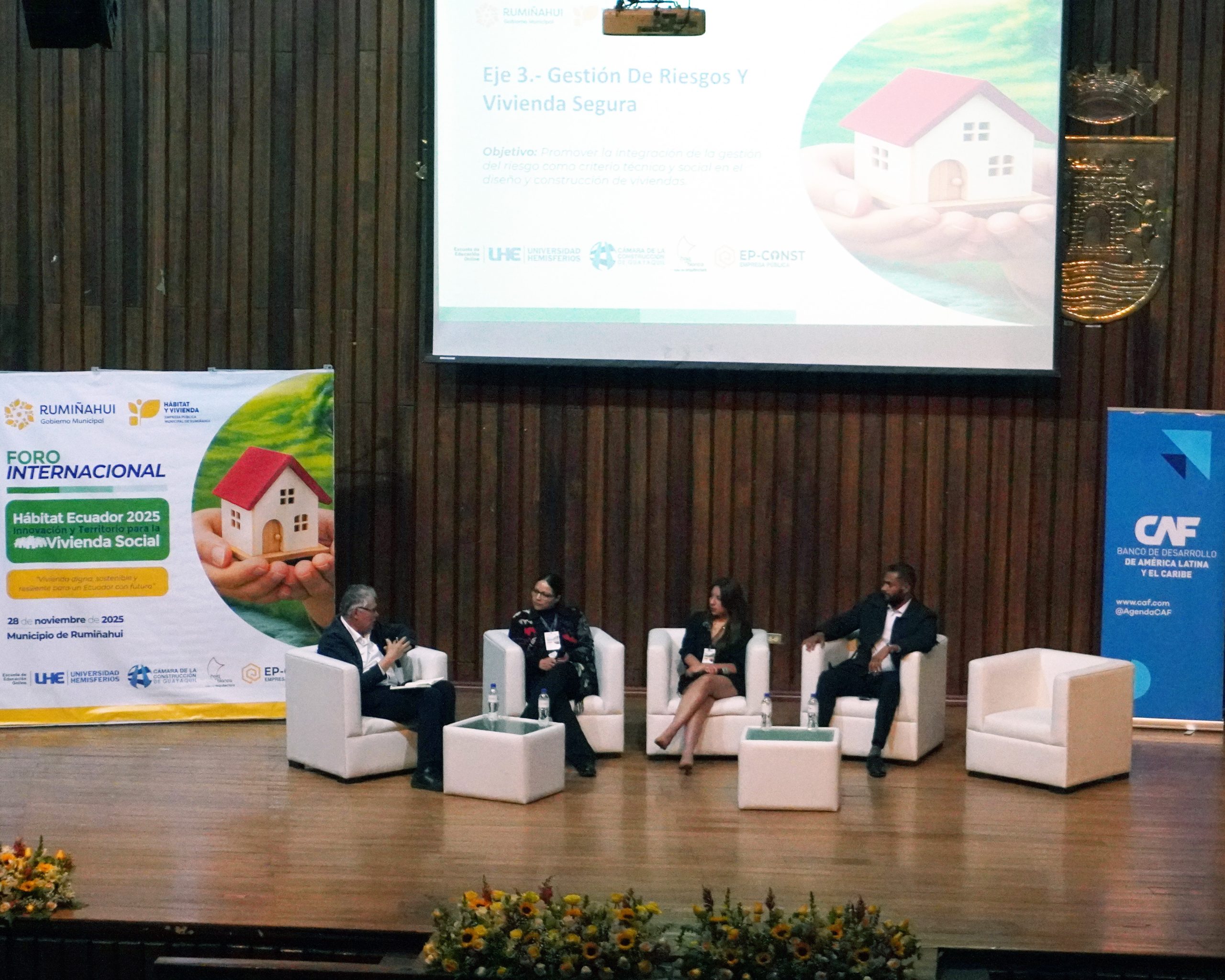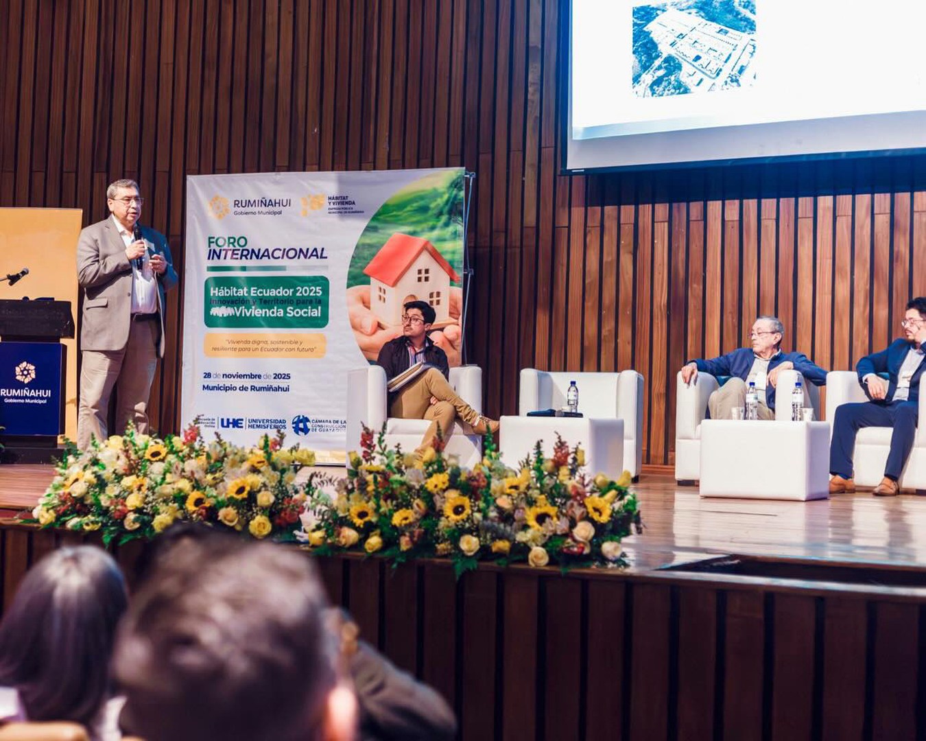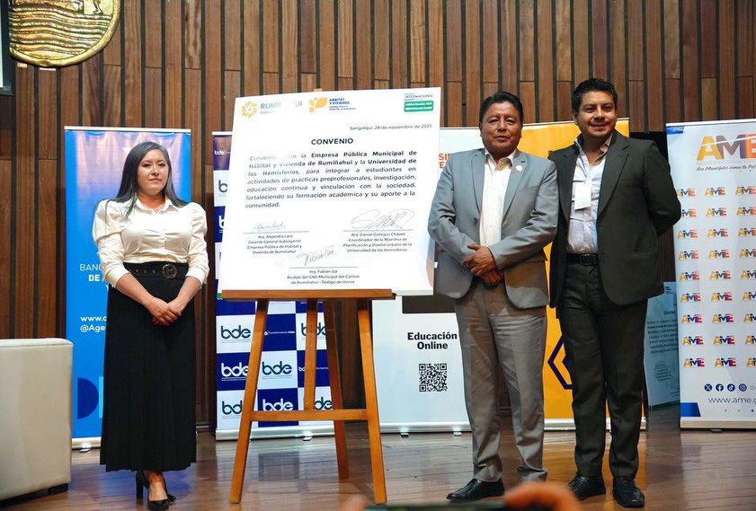 El evento organizado por la Empresa Pública Municipal de Hábitat y Vivienda de Rumiñahui (EPMHVR), en colaboración con la Escuela de Educación Online de la Universidad Hemisferios, contó con la presencia de aliados estratégicos como ONU-Hábitat, Ministerio de la Producción del Perú, Cooperación Técnica Alemana -GIZ; CAF-Banco de Desarrollo de América Latina y el Caribe; Corporación CPTED; Banco de Desarrollo de Ecuador B.P.; Instituto Nacional de Patrimonio Cultural (INPC); Federación de Cámaras de la Construcción de Guayaquil; Colegio de Arquitectos de Ecuador; Asociación de Municipalidades Ecuatorianas y empresas públicas asociadas al hábitat y vivienda social.